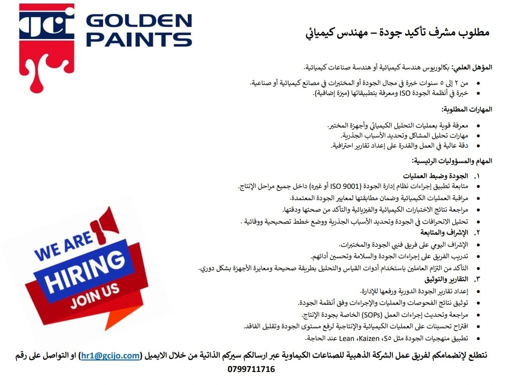 📢 إعلان وظيفي – مطلوب مهندس كيميائي / مشرف تأكيد جودة – شركة جولدن بينانس