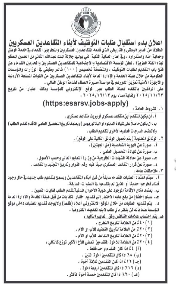 📢 إعلان وظائف الأردن 2025: بدء استقبال طلبات التوظيف لأبناء المتقاعدين العسكريين