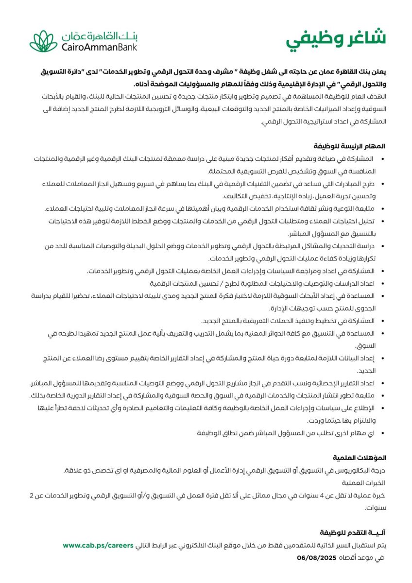 📢 وظيفة شاغرة في بنك القاهرة عمان – مشرف التحول الرقمي