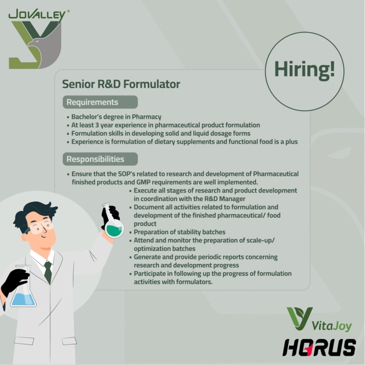 تعلن Jovalley عن توفر وظيفة Senior R&D Formulator ضمن فريق البحث والتطوير.