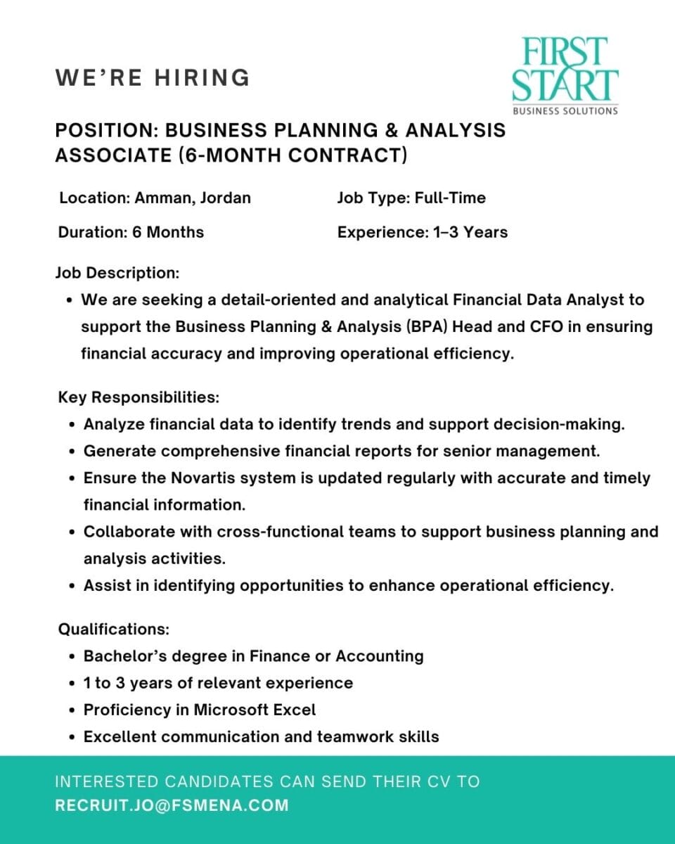 تعلن First Start Business Solutions عن توفر وظيفة Business Planning & Analysis Associate بعقد 6 أشهر، وهي من أبرز فرص العمل المميزة للخبرات المتوسطة في الأردن.