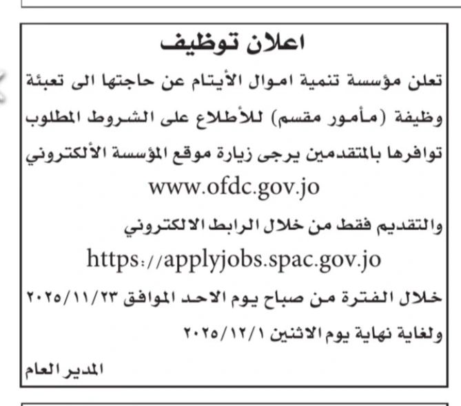 تعلن مؤسسة تنمية أموال الأيتام عن توفر فرصة عمل جديدة لشغل وظيفة مأمور مقسم، وتدعو الباحثين عن وظائف اليوم و فرص عمل 2025 في الأردن إلى التقديم واستغلال هذه الفرصة المميزة ضمن القطاع الحكومي.