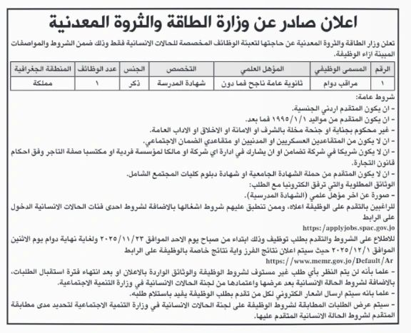 تعلن وزارة الطاقة والثروة المعدنية عن توفر وظيفة حكومية شاغرة لعام 2025 ضمن التعيينات المخصصة للحالات الإنسانية، وذلك وفق الشروط والضوابط المعتمدة. هذا الإعلان موجّه للراغبين في الحصول على وظائف اليوم وفرص عمل حكومية في الأردن لعام 2025.