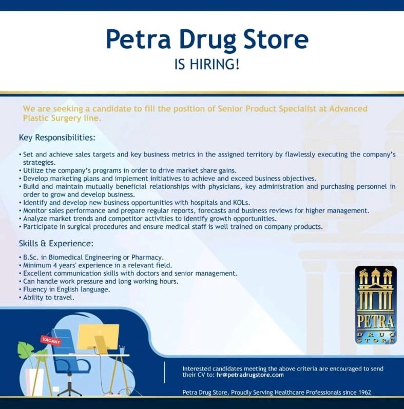 تعلن Petra Drug Store عن حاجتها إلى Senior Product Specialist للعمل على خط منتجات Advanced Plastic Surgery & Aesthetics، وهي فرصة مميزة للخبراء في مجالات التجميل، الجراحة التجميلية، والمبيعات الطبية.
