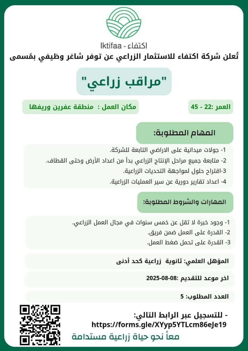 📢 إعلان وظيفة مراقب زراعي – عفرين وريفها