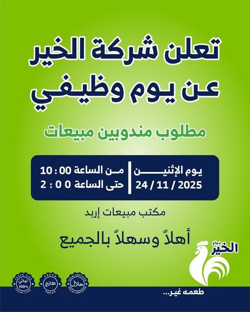 تعلن شركة دجاج الخير عن يوم وظيفي مفتوح لاستقطاب مندوبين مبيعات متميزين ضمن فرص عمل 2025 في إربد.