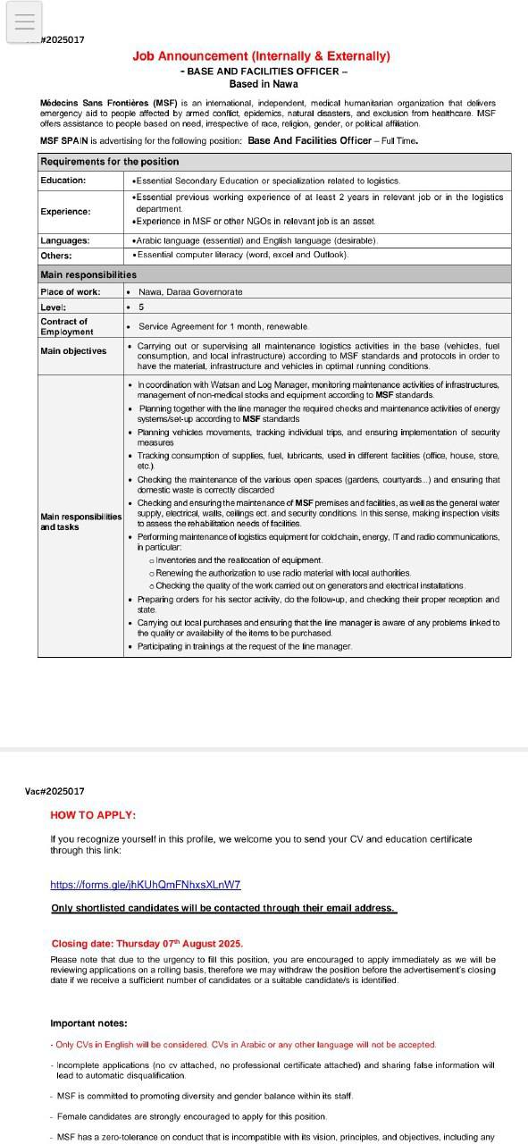 2. مسؤول القاعدة والمرافق – درعا/نوى