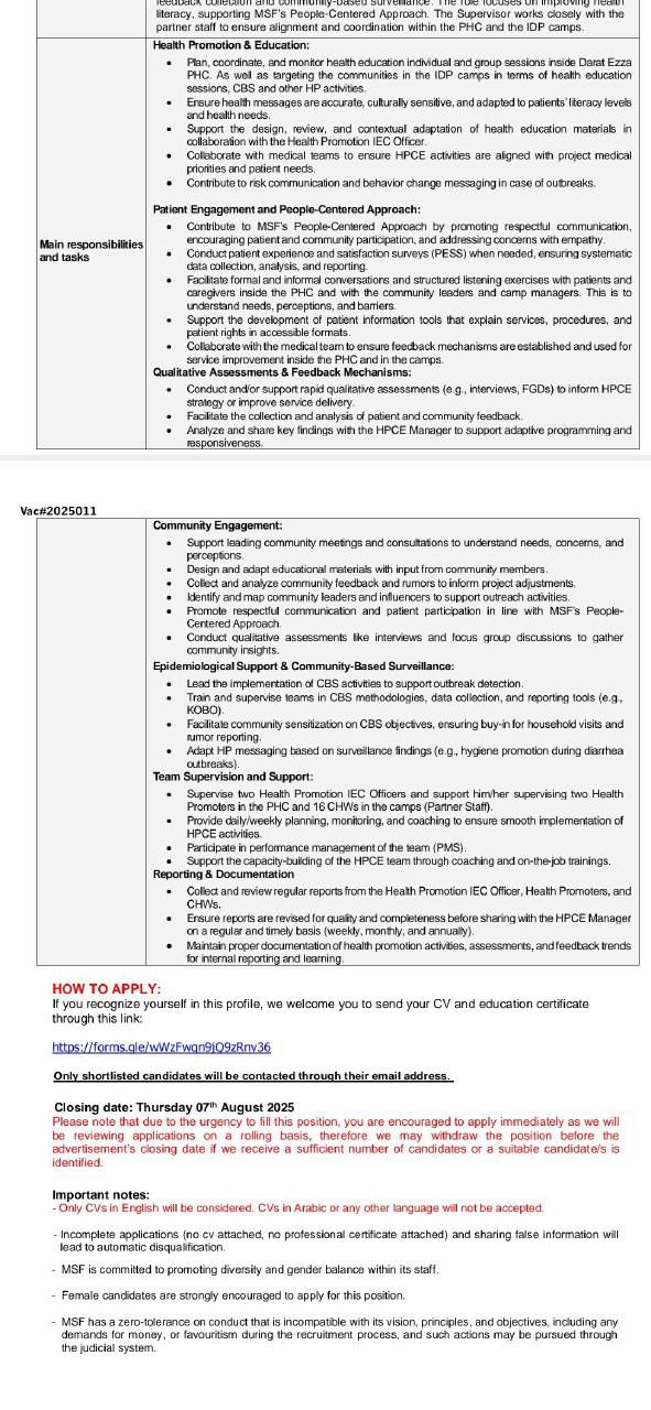 المؤهلات: شهادة في الصحة العامة/اجتماعية، خبرة سنتين.