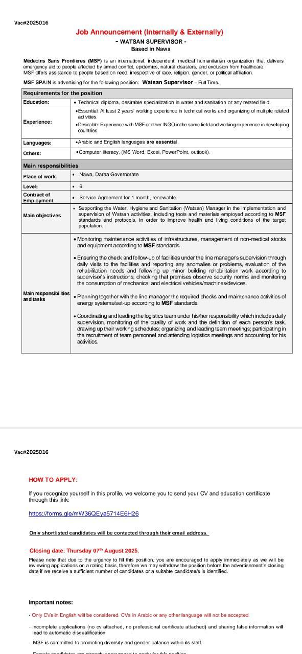 4. مشرف WATSAN (مياه وصرف صحي) – درعا/ناوا