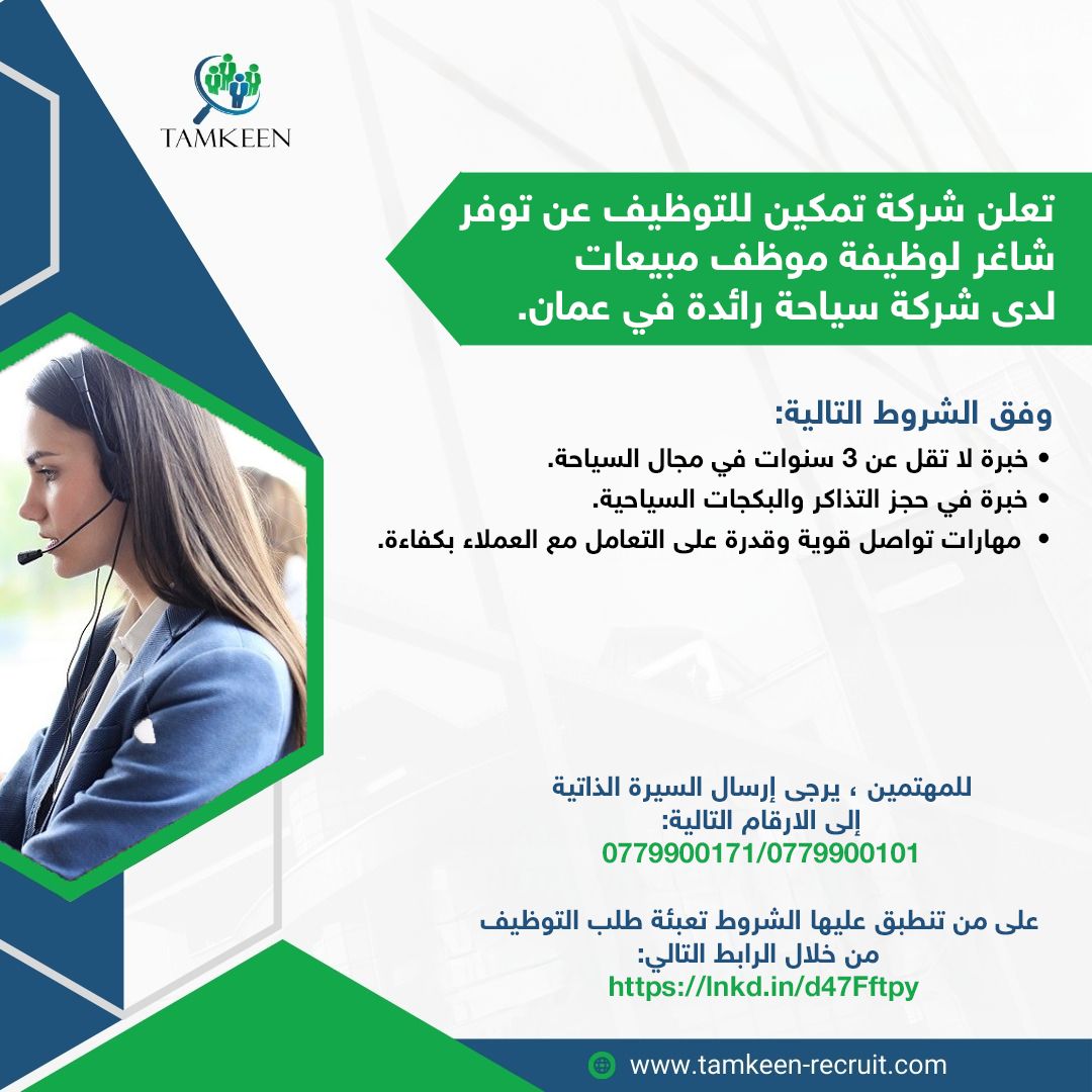 تُعلن شركة تمكين للتوظيف عن توفر وظائف اليوم لشغل منصب موظف مبيعات في شركة سياحة رائدة في عمان، وذلك ضمن الشروط التالية: