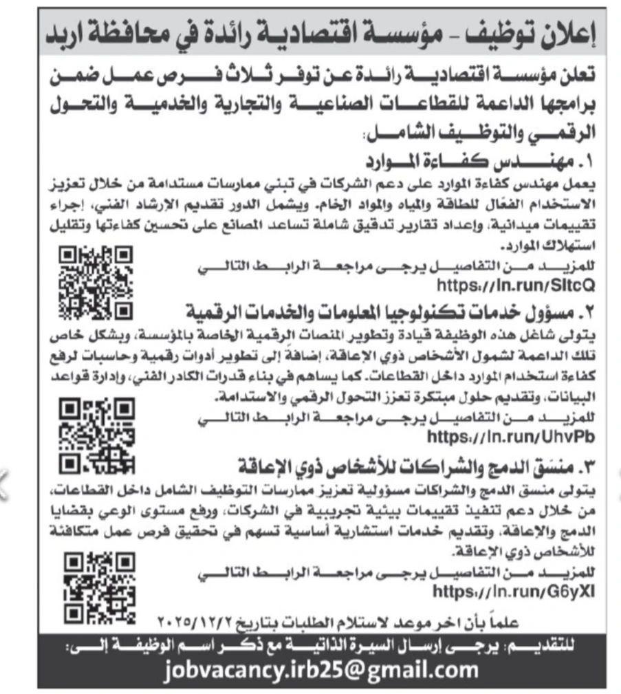 تعلن مؤسسة اقتصادية رائدة في محافظة إربد عن توفر ثلاث فرص عمل ضمن برامجها الداعمة للقطاعات الصناعية والتجارية والخدمية والتحول الرقمي والتوظيف الشامل.