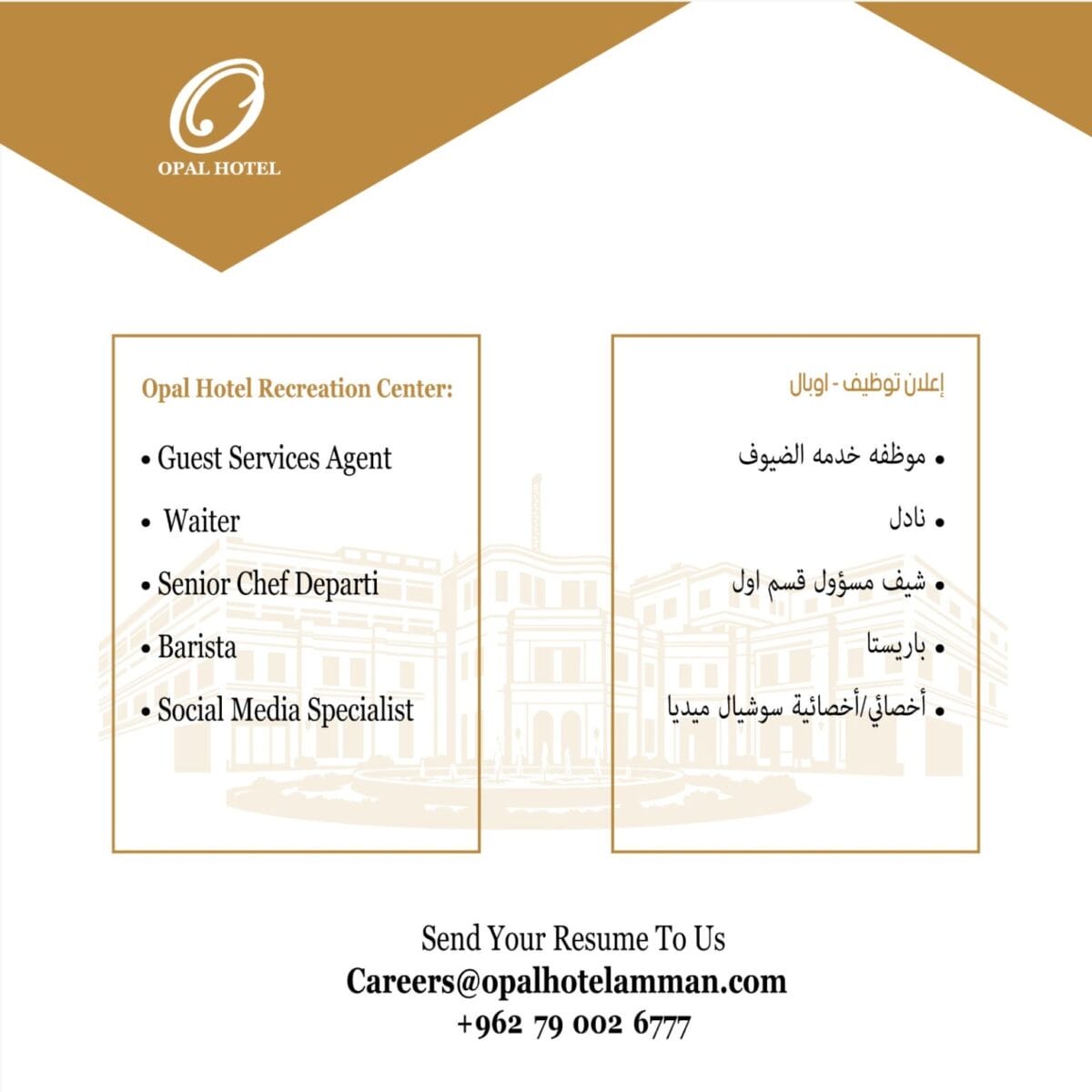 يعلن فندق أوبال عمان – Opal Hotel عن مجموعة وظائف اليوم وفرص توظيف جديدة للباحثين عن فرص عمل 2025 في قطاع الضيافة والـ Hospitality Jobs.