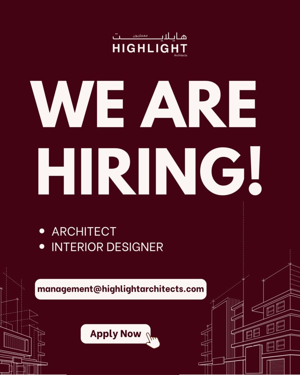 تعلن شركة Highlight Architects عن حاجتها إلى Architect / مهندس معماري مبدع للانضمام إلى فريق التصميم الهندسي، ضمن بيئة عمل احترافية في مجال الهندسة المعمارية والتصميم ثلاثي الأبعاد.