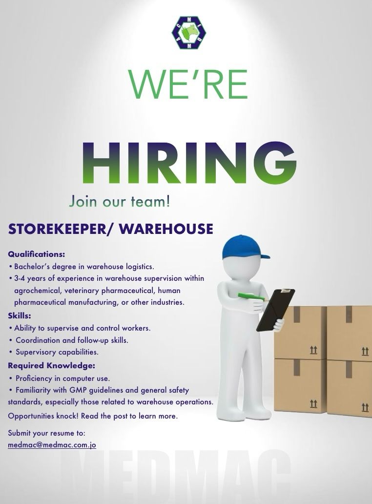 تعلن شركة رائدة في قطاع الأدوية والمستودعات الطبية في إربد – الرمثا عن حاجتها لشغل وظيفة أمين مستودع / Warehouse Keeper.