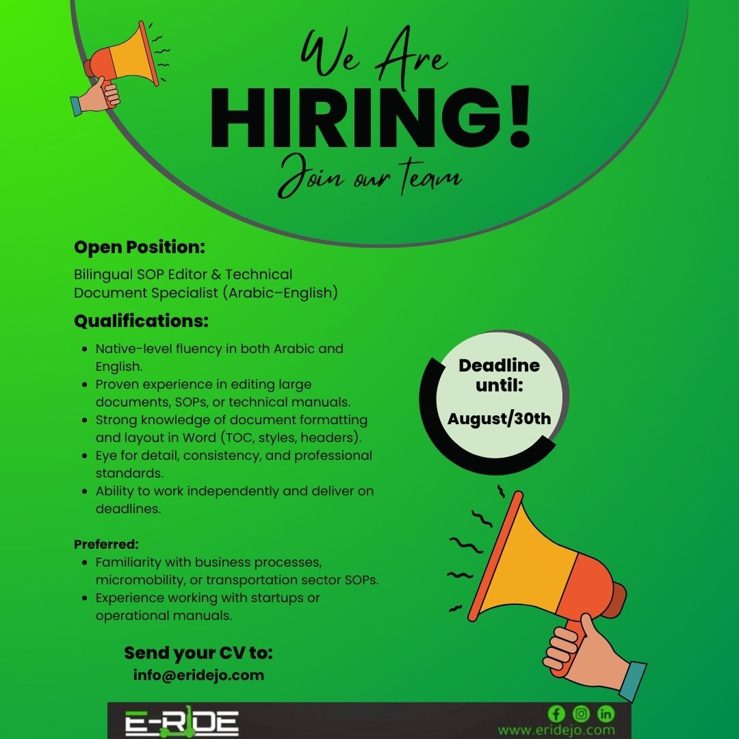فرصة مميزة للانضمام إلى فريق E-Ride Jo، الشركة الرائدة في حلول التنقل الذكي والصديق للبيئة في الأردن.