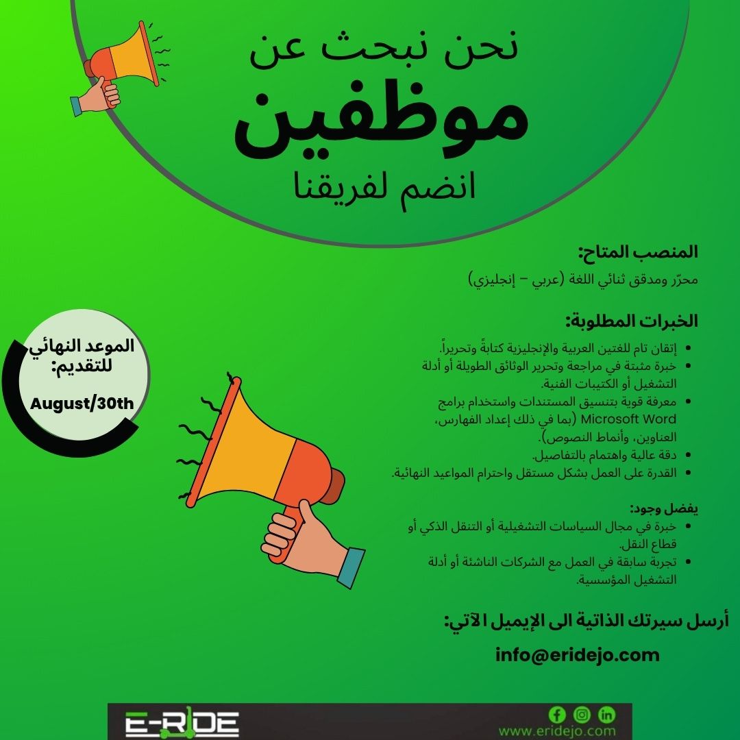 فرصة مميزة للانضمام إلى فريق E-Ride Jo، الشركة الرائدة في حلول التنقل الذكي والصديق للبيئة في الأردن.