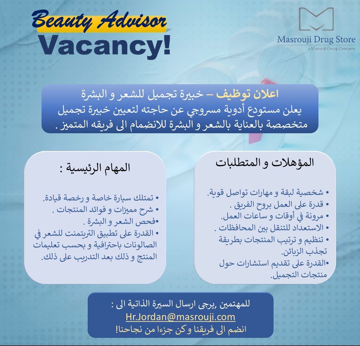 يعلن مستودع أدوية مسروجي في عمان – الأردن، عن حاجته لتوظيف خبيرة تجميل ميدانية متخصصة في العناية بالشعر والبشرة، للانضمام إلى فريقه المميز.