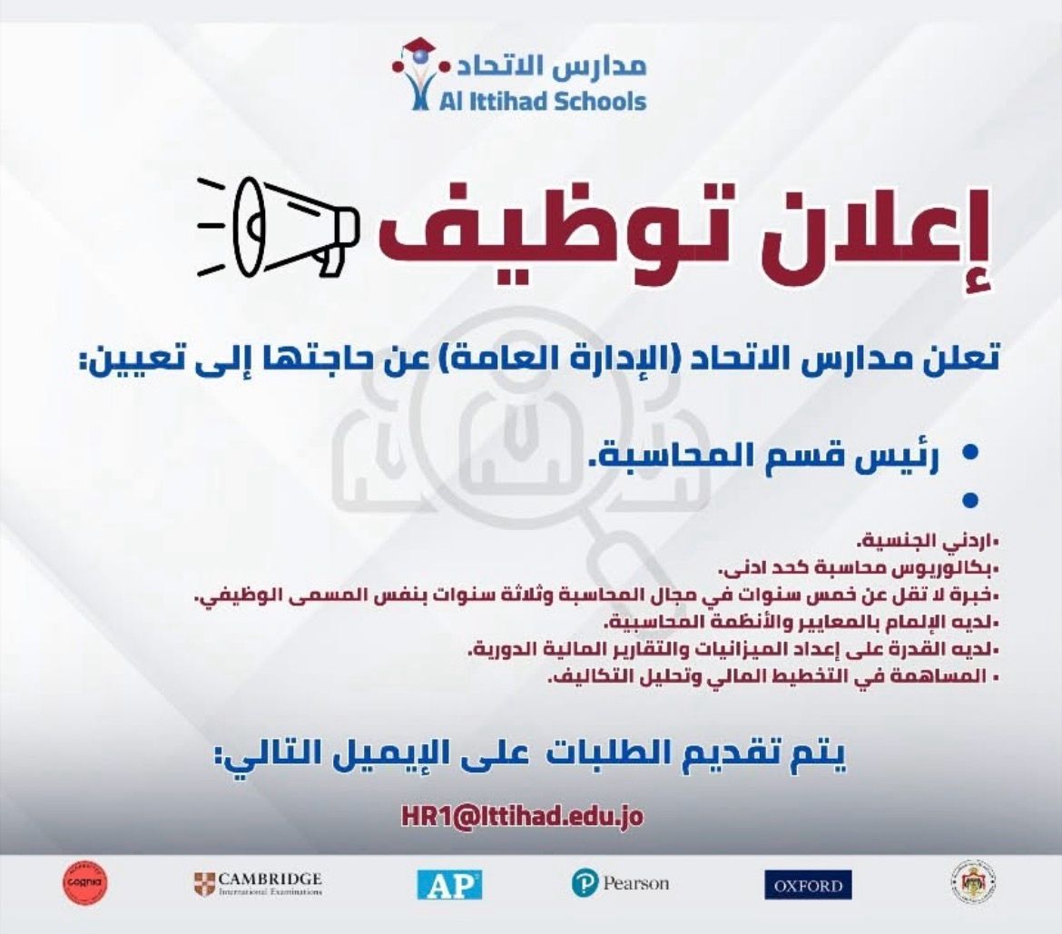 وظيفة رئيس قسم المحاسبة – مدارس الاتحاد | فرص عمل محاسبة في عمّان
