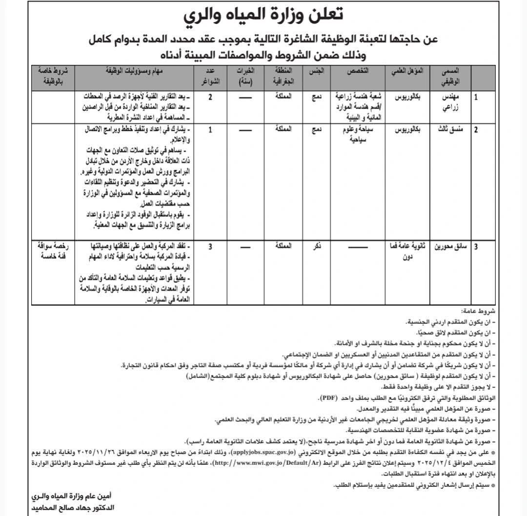 تعلن وزارة المياه والري عن فتح باب التقديم لشغل عدد من الوظائف الشاغرة بعقود محددة المدة وبدوام كامل لعام 2025، وذلك حسب المؤهلات والشروط المبينة أدناه.