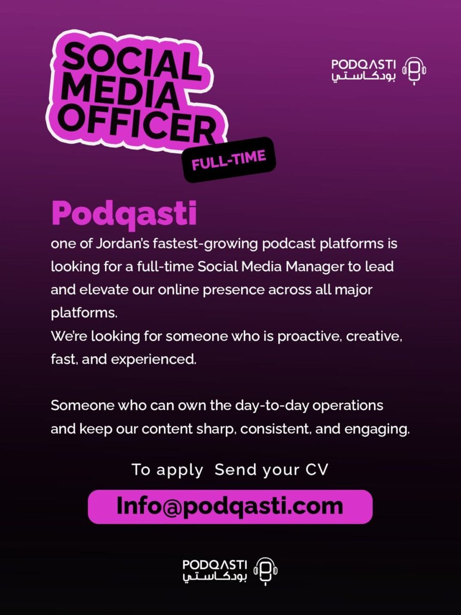 تعلن Podqasti، واحدة من أسرع منصات البودكاست نموًا في الأردن، عن حاجتها إلى مدير/ة سوشال ميديا Social Media Manager للعمل بدوام كامل ومقره عمان. نبحث عن شخص مبدع، سريع التنفيذ، وذو خبرة قادر على إدارة المحتوى اليومي وبناء حضور رقمي قوي على جميع المنصات.