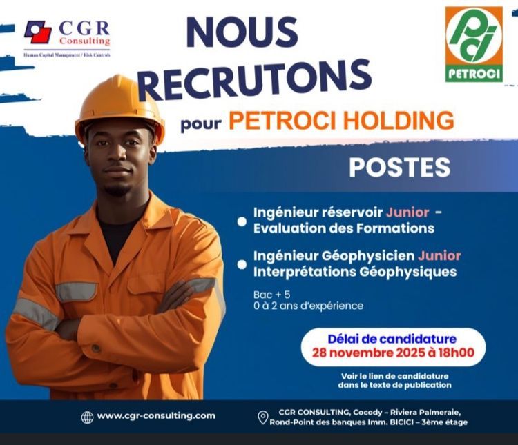 تعلن PETROCI Holding عبر شركة CGR Consulting عن فتح باب التوظيف لعام 2025 لشغل وظائف هندسية جونيور في مجال الخزانات والجيوفيزياء، وهي فرص مميزة للخريجين الجدد الباحثين عن بداية قوية في مسارهم المهني داخل قطاع النفط والطاقة.