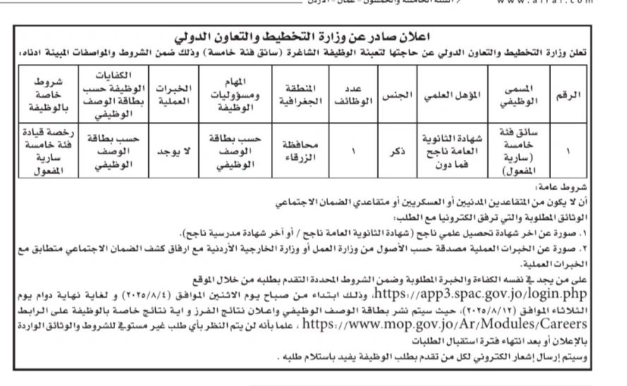 تُعلن وزارة التخطيط والتعاون الدولي عن حاجتها لتعبئة شاغر سائق فئة خامسة (سائق حكومي) ضمن كوادرها، وذلك وفقًا للشروط والتفاصيل التالية: