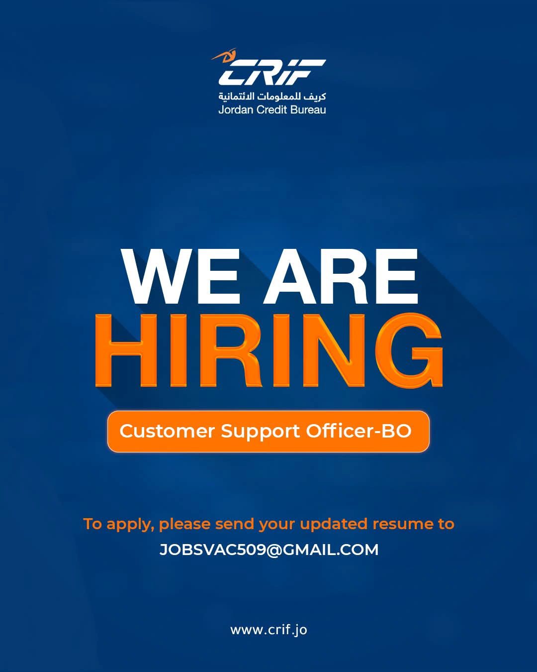 تعلن CRIF Jordan عن حاجتها إلى Customer Support Officer / Back Office Specialist للانضمام إلى فريقها الديناميكي، وللمهتمين بتقديم الدعم الفني والتعامل مع مزودي البيانات.