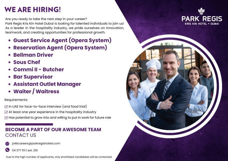 يعلن فندق Park Regis Kris Kin Hotel – Dubai عن فتح باب التوظيف لعدد من الوظائف المميزة ضمن قطاع الضيافة. إذا كنت مميّزًا في عملك وتبحث عن بيئة داعمة تتيح لك التطور الوظيفي، فهذه فرصتك للانضمام إلى فريق يعمل على الابتكار وتقديم أفضل التجارب للضيوف.