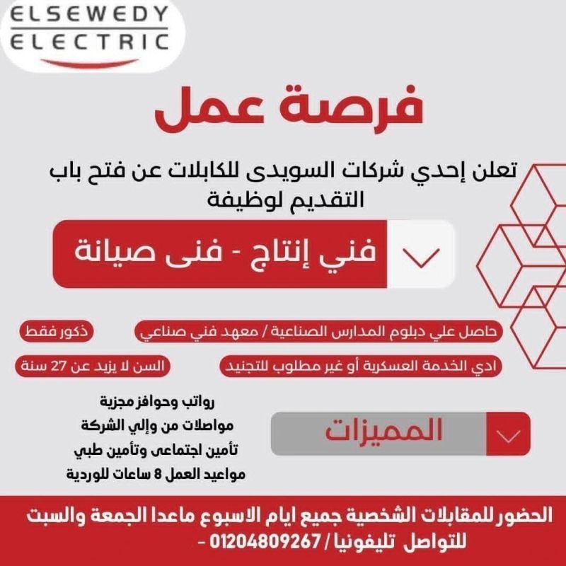 تعلن إحدى شركات السويدي للكابلات عن فتح باب التقديم لوظائف فني إنتاج و فني صيانة، وذلك للعمل ضمن فريق صناعي متميز داخل بيئة عمل مستقرة توفر مزايا قوية وفرص تطوير حقيقية.