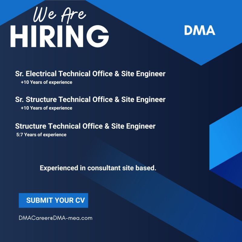 تعلن شركة DMA الهندسية عن فتح باب التوظيف لعدد من الوظائف الفنية والهندسية المتخصصة، للعمل ضمن مشاريع كبرى تعتمد معايير الجودة والاستشارات الهندسية الحديثة.