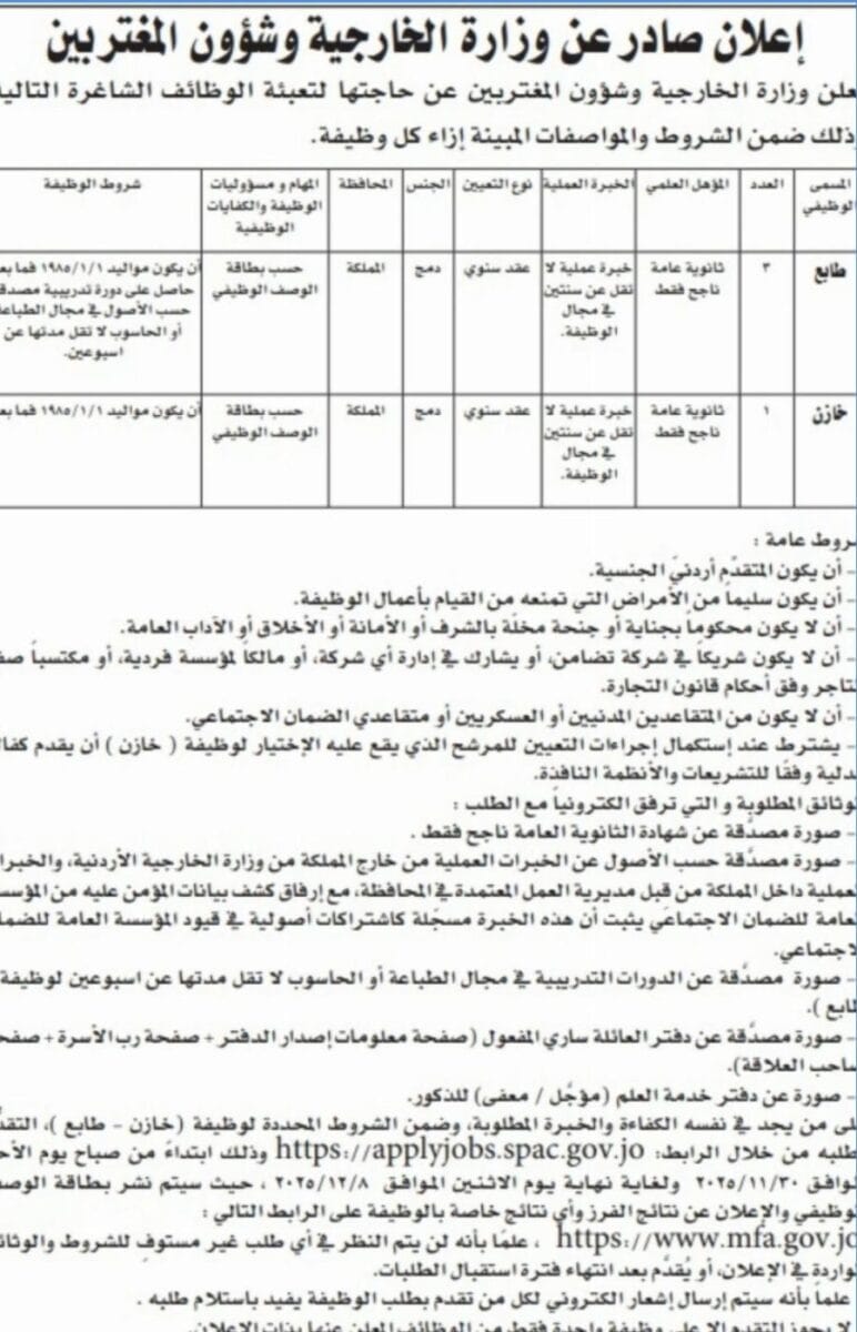 إعلان توظيف في وزارة الخارجية الأردنية 2025 لوظائف خازن وطابع