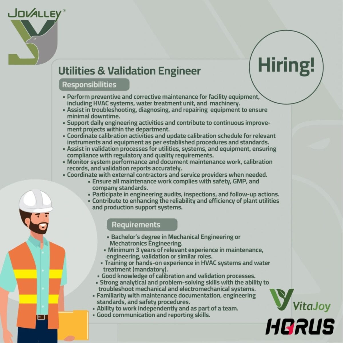 تعلن JoValley بالتعاون مع VitaJoy وHORUS عن حاجتها إلى Utilities & Validation Engineer للانضمام إلى فريقها الهندسي المتخصص. فرصة مثالية للمهندسين ذوي الخبرة في أنظمة المرافق، الصيانة، الفاليديشن، والمعايرة للعمل ضمن بيئة احترافية تدعم التطوير المستمر.