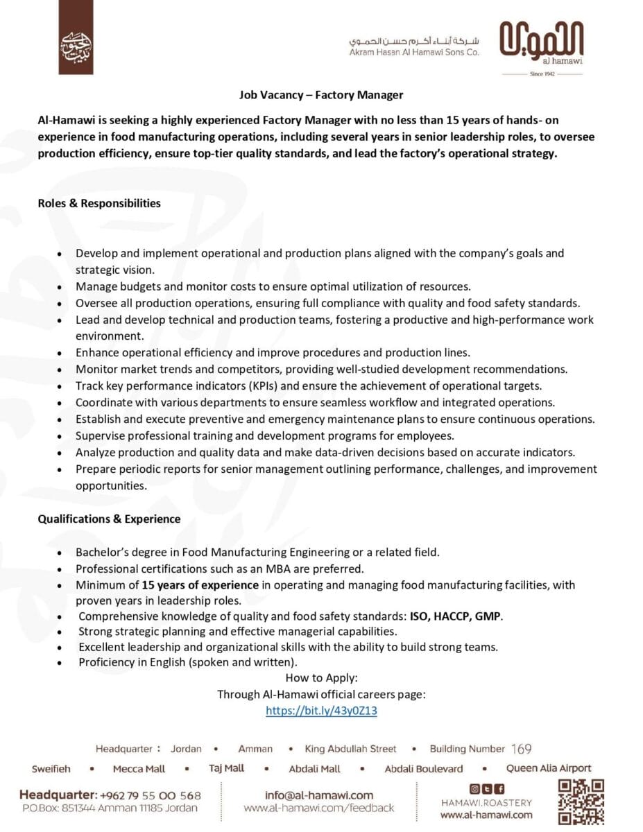 يُعد قطاع التصنيع الغذائي من أكثر القطاعات نمواً في الأردن، وتوفر شركة الحموي فرصة رائدة للمديرين ذوي الخبرة للانضمام إلى مؤسسة عريقة ذات تاريخ طويل ومعايير عالمية في الجودة والإنتاج.