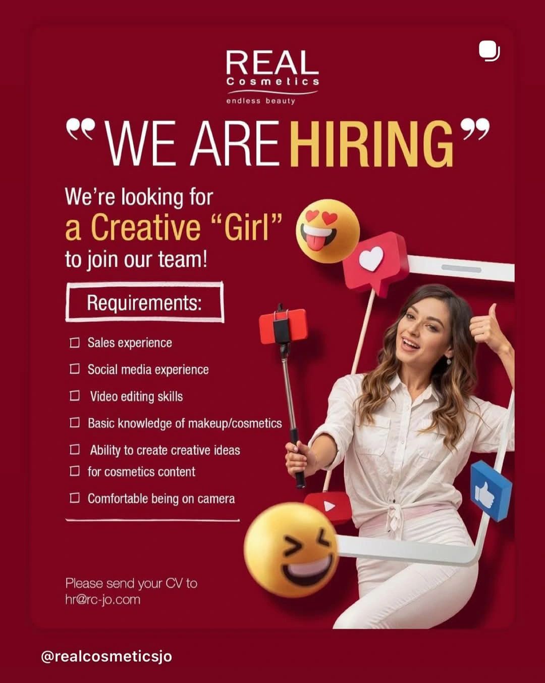 إذا كنتِ تبحثين عن وظيفة كرييتيف في مجال التجميل وصناعة محتوى السوشيال ميديا، فإن Real Cosmetics توفر فرصة مثالية للموهوبات اللواتي يمتلكن المهارات الإبداعية والرغبة في التطور في قطاع الجمال.