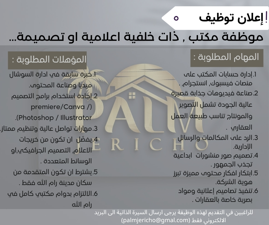 يعلن مكتب Palm Jericho عن حاجته لتوظيف موظف/ة استقبال ومحتوى بدوام كامل في مدينة رام الله.