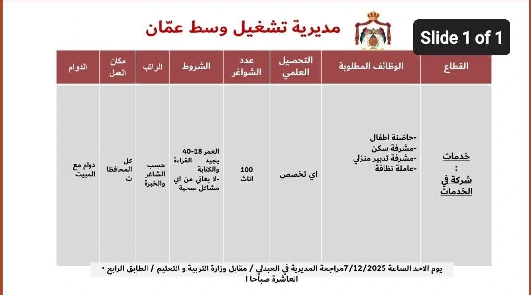 مديرية تشغيل وسط عمّان تعلن عن توفر مجموعة واسعة من الوظائف الشاغرة للذكور والإناث للعمل لدى إحدى شركات الخدمات الكبرى في مختلف المحافظات، مع رواتب تحدد حسب الوظيفة والخبرة، ودوام كامل مع المبيت لبعض الوظائف.