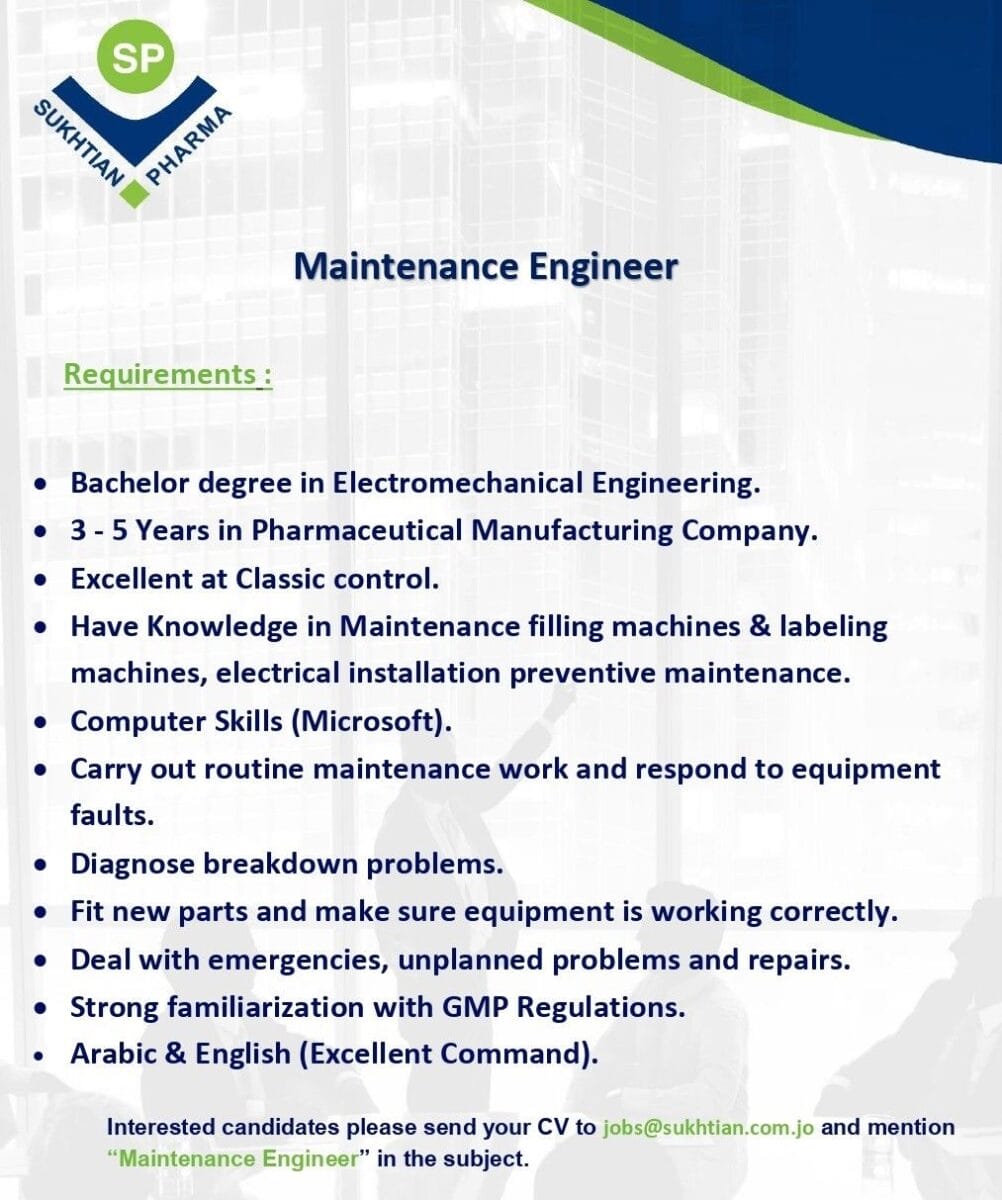 تعلن شركة سختيان للأدوية عن حاجتها لتعيين مهندس صيانة (Maintenance Engineer)