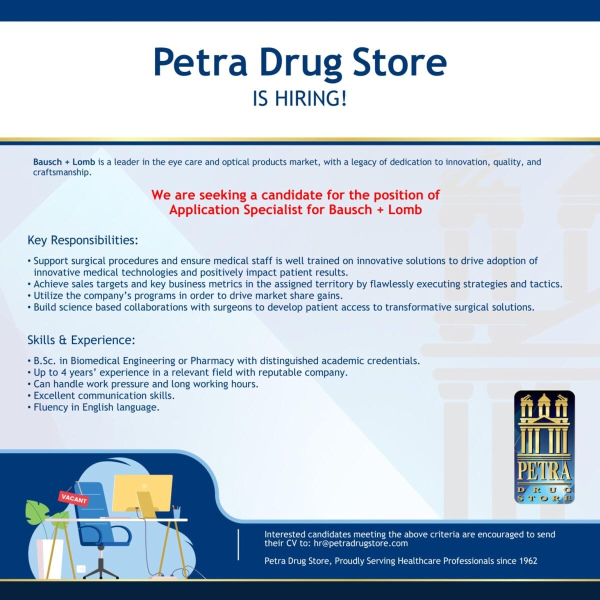 تعلن Petra Drug Store عن حاجتها لتعيين أخصائي تطبيقات (Application Specialist) لصالح شركة Bausch + Lomb الرائدة في تقنيات العناية بالعيون والمنتجات البصرية.