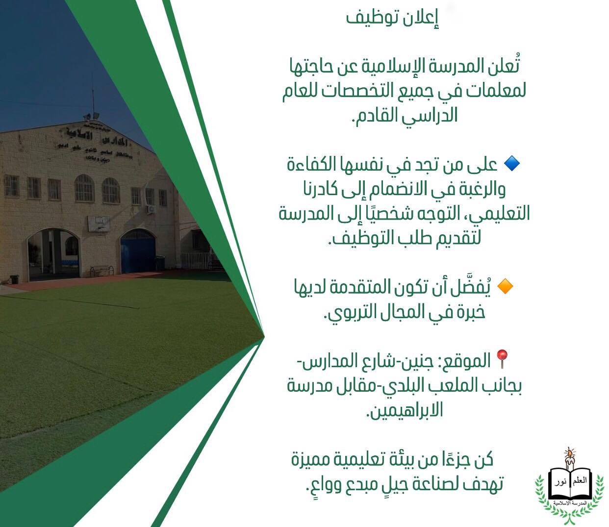 تُعلن المدرسة الإسلامية الثانوية في جنين عن حاجتها إلى معلمات في جميع التخصصات للانضمام إلى كادرها التعليمي للعام الدراسي القادم.