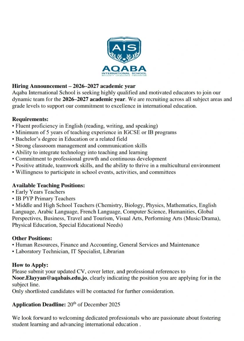 تعلن مدرسة العقبة الدولية عن فتح باب التوظيف للعام الأكاديمي 2026–2027، وتدعو المعلمين والكوادر الإدارية المؤهلين للانضمام إلى فريقها التعليمي المتميز. تبحث المدرسة عن محترفين يمتلكون خبرة، شغفًا بالتعليم، وقدرة على الإسهام في بيئة تعليمية دولية متطورة.