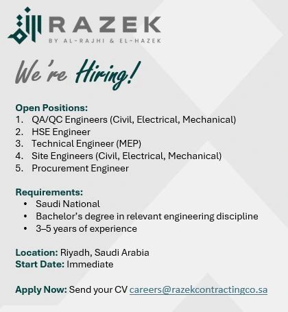 وظائف هندسية شاغرة في شركة RAZEK بالرياض | تقديم فوري