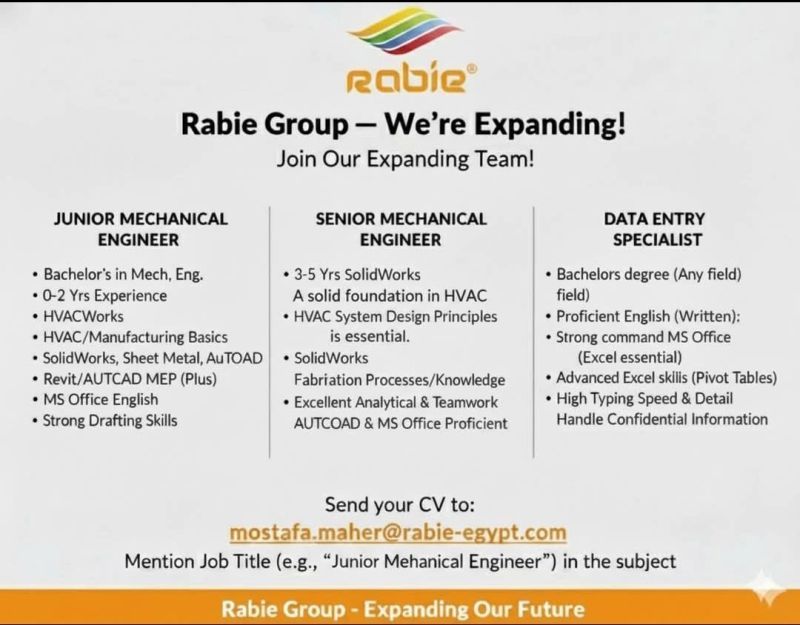 فرص عمل هندسية وإدارية لدى مجموعة ربيع | وظائف ميكانيكا وبيانات
