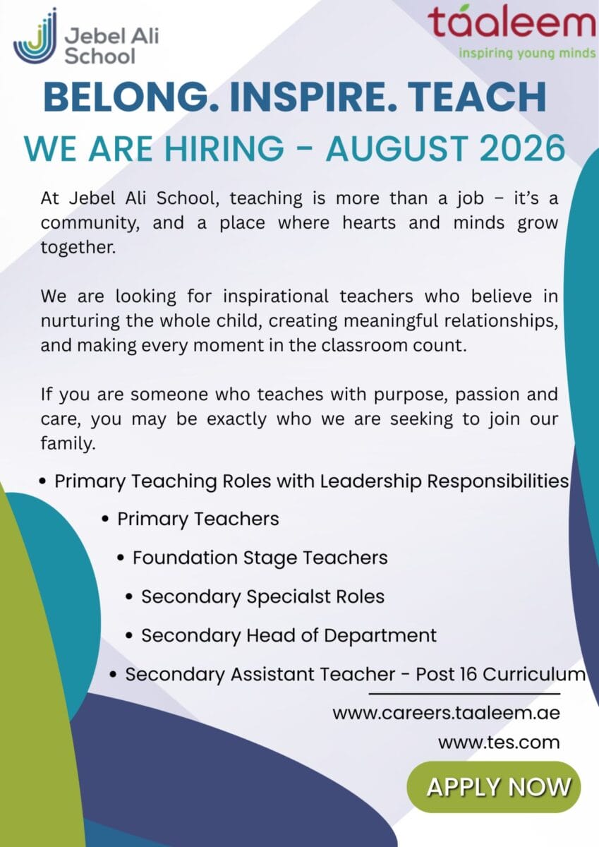 تعلن مدرسة جبل علي – دبي عن فتح باب التوظيف لوظائف تعليمية مميزة تبدأ في أغسطس 2026. نحن نبحث عن معلمين ملهمين يمتلكون الشغف، والقدرة على بناء علاقات تعليمية مؤثرة، والإيمان بتطوير الطالب ككل داخل بيئة مدرسية داعمة.
