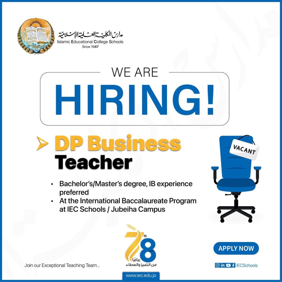 تُعلن مدارس الكلية العلمية الإسلامية / عمّان عن توفر شواغر للعام الدراسي الجديد، في عدد من التخصصات ضمن بيئة تعليمية متميزة.