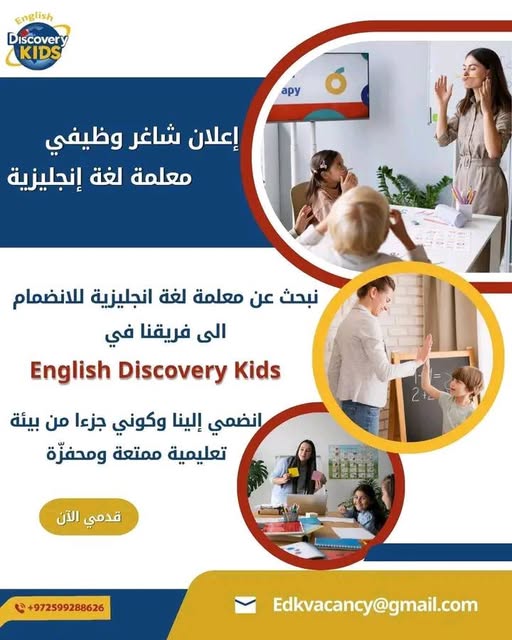 تُعلن English Discovery Kids في طولكرم عن توفر شاغر وظيفي لمعلمـة لغة إنجليزية للانضمام إلى فريقها التربوي المتخصص. بيئة تعليمية حديثة بانتظارك!