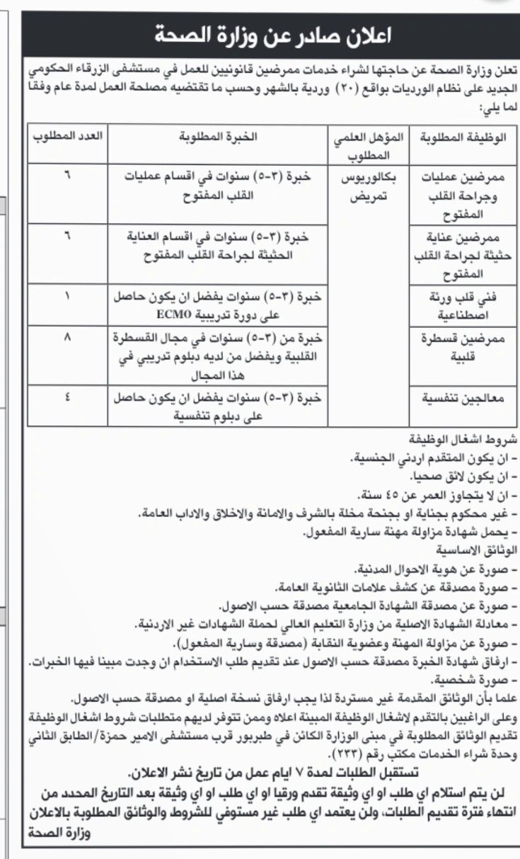 أعلنت وزارة الصحة عن رغبتها بشراء خدمات ممرضين قانونيين ومعالجين للعمل في مستشفى الزرقاء الحكومي الجديد بنظام الورديات وبعقود شهرية قابلة للتجديد لعام كامل، وذلك ضمن عدد من التخصصات الحيوية المرتبطة بجراحة القلب المفتوح، العناية الحثيثة، التمريض القلبي، ECMO، القسطرة القلبية، والمعالجة النفسية.