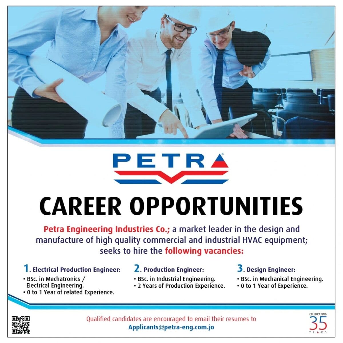 تعلن شركة Petra Engineering Industries Co.، الرائدة في تصميم وتصنيع أنظمة التكييف التجارية والصناعية عالية الجودة، عن توفر مجموعة من الشواغر الهندسية ضمن فريقها المتنامي. تدعو الشركة المهتمين ممن تنطبق عليهم المتطلبات إلى التقدم وإرسال سيرهم الذاتية.