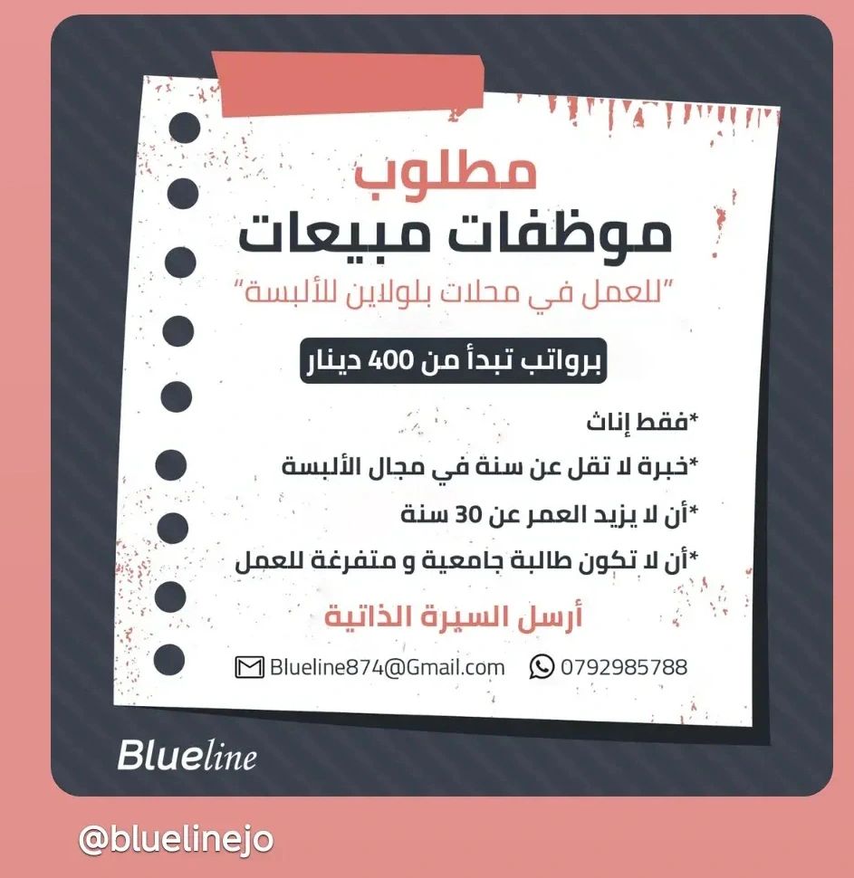 تعلن محلات بلولاين للألبسة عن حاجتها إلى موظفات مبيعات للعمل داخل فروعها، برواتب تبدأ من 400 دينار، وفق المتطلبات التالية: