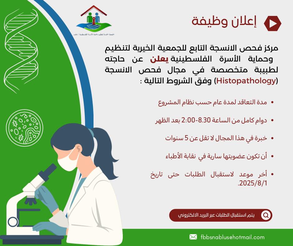 يُعلن مركز فحص الأنسجة التابع للجمعية الخيرية لتنظيم وحماية الأسرة الفلسطينية عن حاجته إلى: