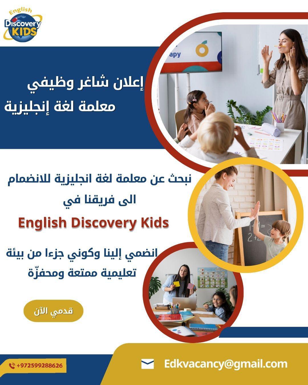 تُعلن English Discovery Kids عن توفر شاغر وظيفي لمعلمـة لغة إنجليزية للانضمام إلى فريقها التربوي في مدينة رام الله. إذا كنتِ تملكين الشغف بالتعليم وتسعين لإحداث فرق في بيئة تعليمية حديثة، فهذه فرصتك!